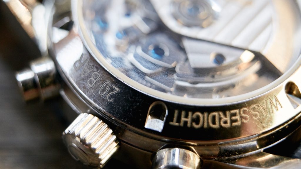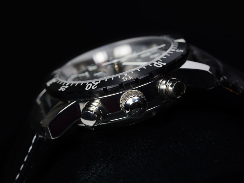 At the 2, 3 and 4 o’clock positions are the polished protected chrono pushers and double O-ring sealed screw down crown with a “G” marked on it. The pushers are hard and a definite click is heard when pressed. Protected pushers and sealed crown enables reliable pressure resistance of 20 bar.