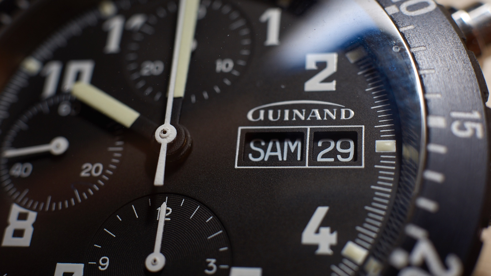 At 3 o’clock is the day-date window with white text on black background, white outlining and the Guinand logo above, emulatig the shape of an airplane wing.