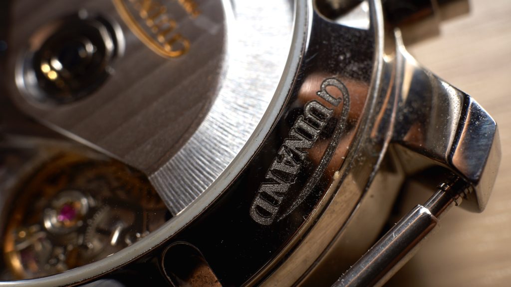 Viewing the Guinand 40.50.01 from the side, you’ll notice that the lugs sloping sharply downward, like the wings of a fighter jet, for a better fit on the wrist. The case appears a bit tall, and it is at 15.2 mm. Guinand gets its height from its bulging case back, which is topped off with a domed sapphire crystal. Though it’s cool in appearance, it forces the watch to sit a bit higher off the wrist rather than sink into it. The sapphire crystal edge on top is a fraction of mm raised above the edge of the bezel.