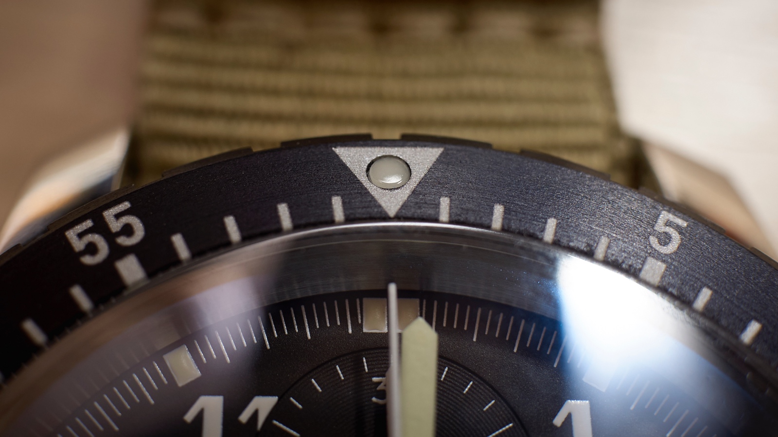 On top is the light metal bi-directional pilots bezel, common on vintage models. Matte black, the bezel shows silver numerals at five minute/second intervals and hash markers in between and with a triangle at 12-o-clock which has a luminescence dot in the middle that glows in the dark. Along its side is subtle, rectangled edging which provides a nice tactile feel when rotating the bezel.