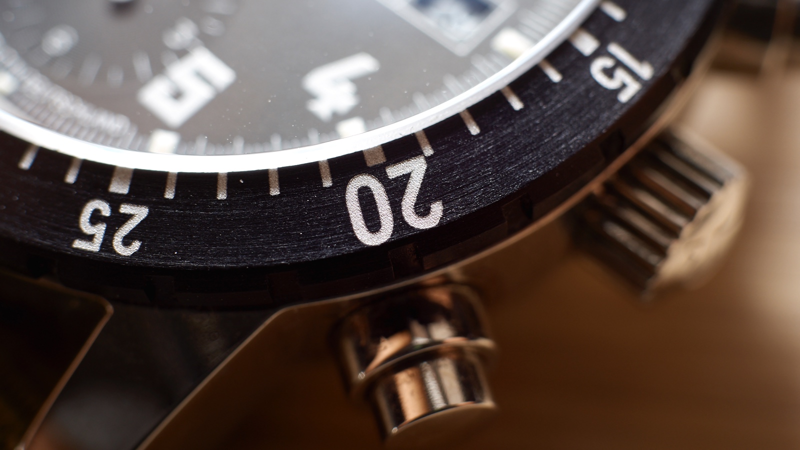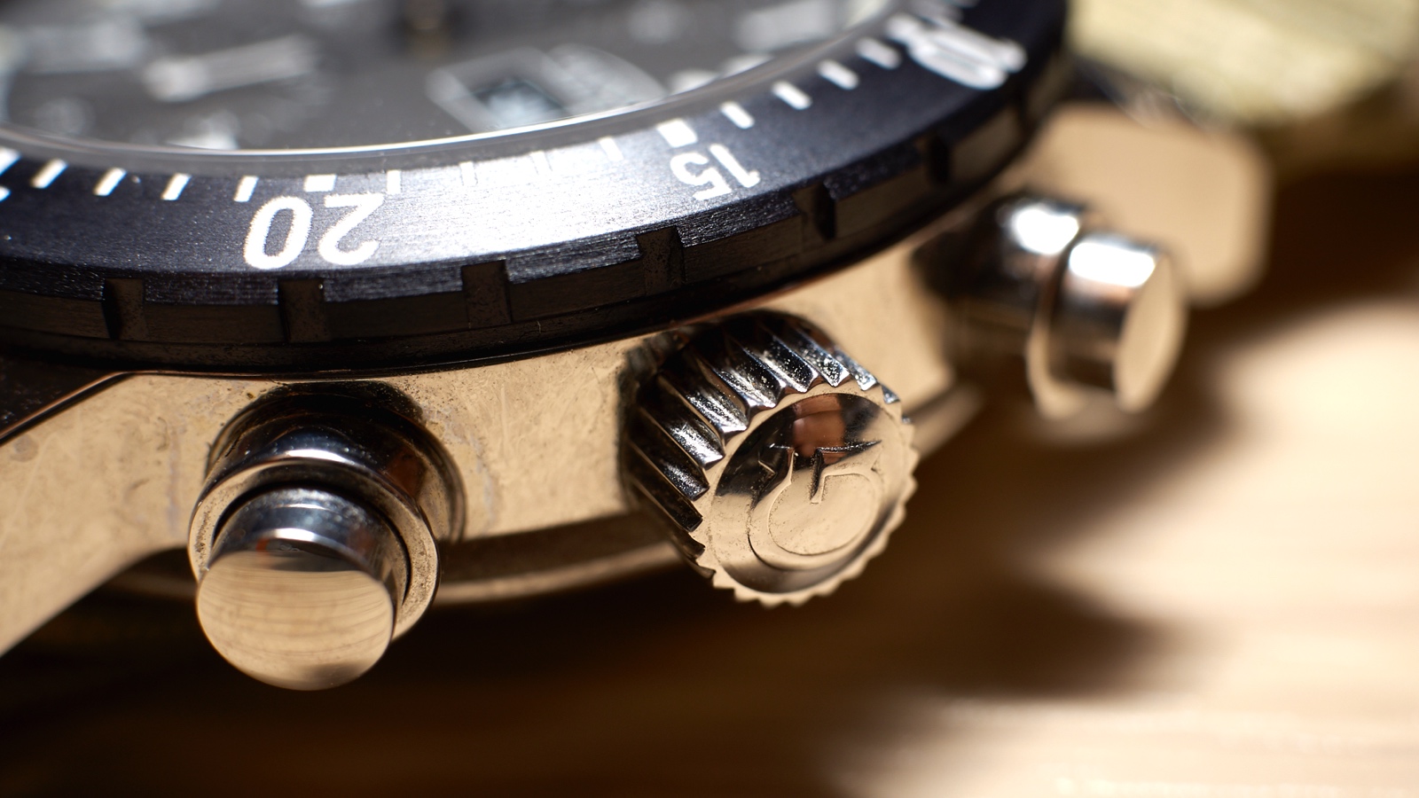 At the 2, 3 and 4 o’clock positions are the polished protected chrono pushers and double O-ring sealed screw down crown with a “G” marked on it. The pushers are hard and a definite click is heard when pressed. Protected pushers and sealed crown enables reliable pressure resistance of 20 bar.