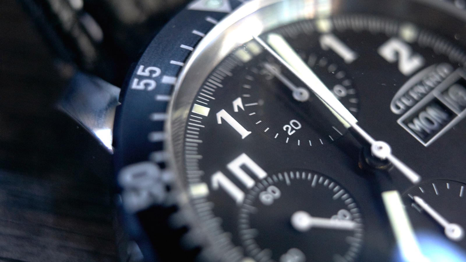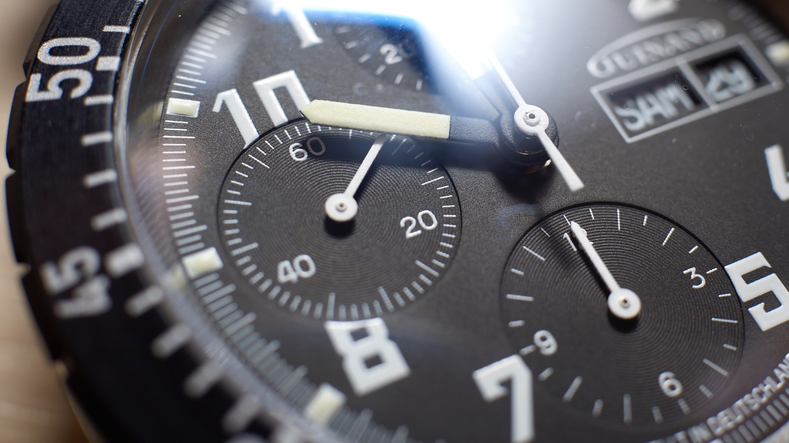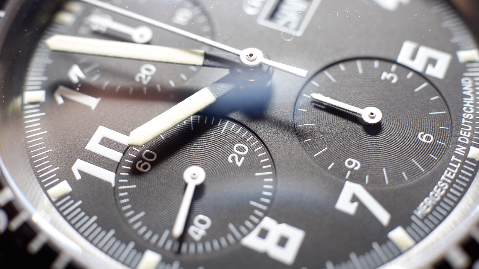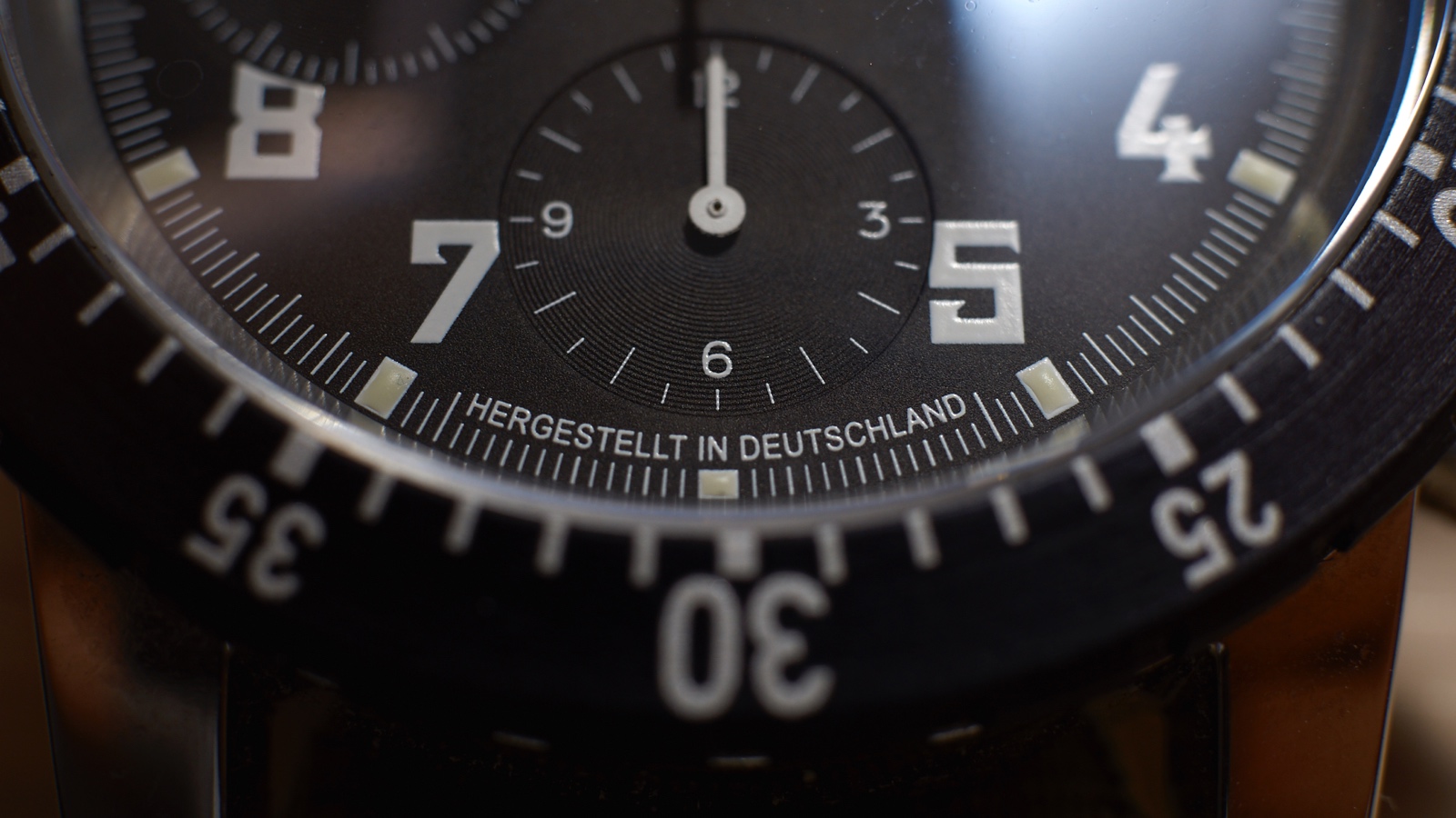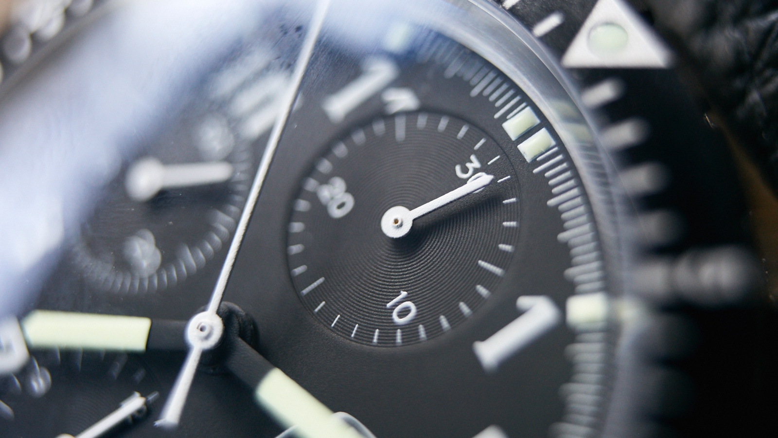 At 12 o’clock, the chrono minute counter shows markers at each minute and numerals at 10, 20 and 30.