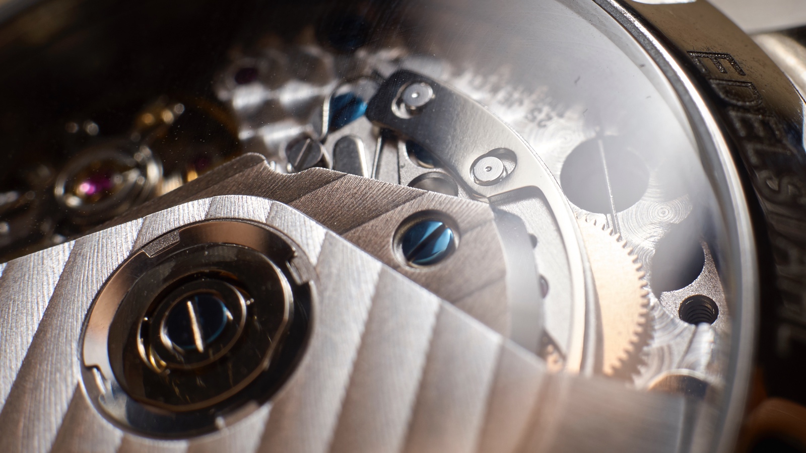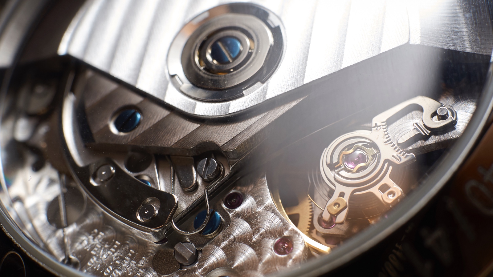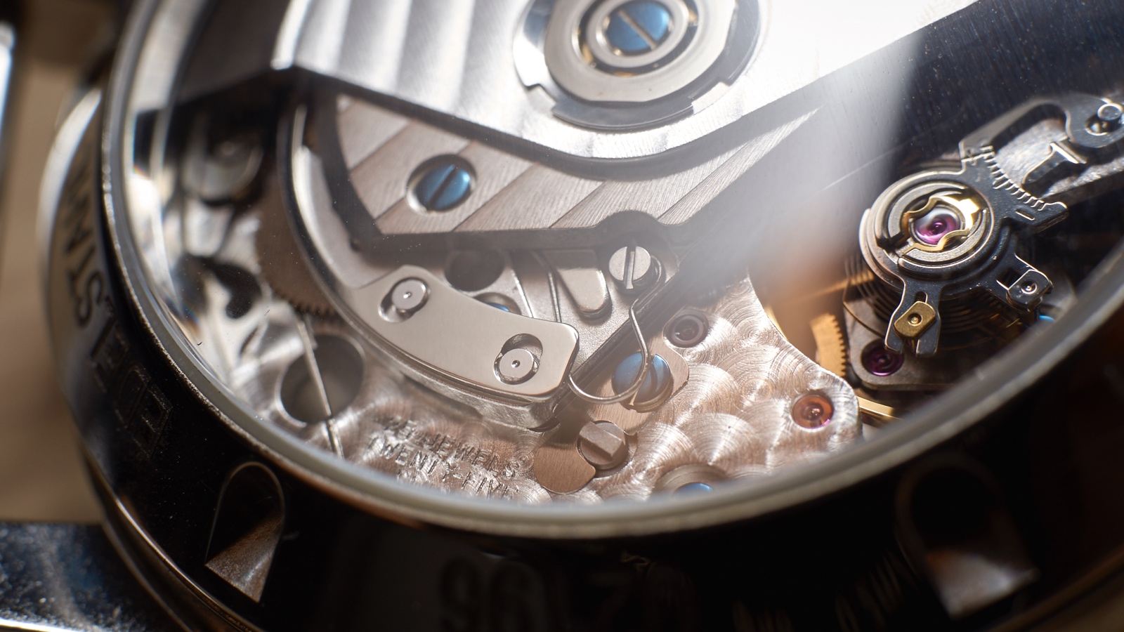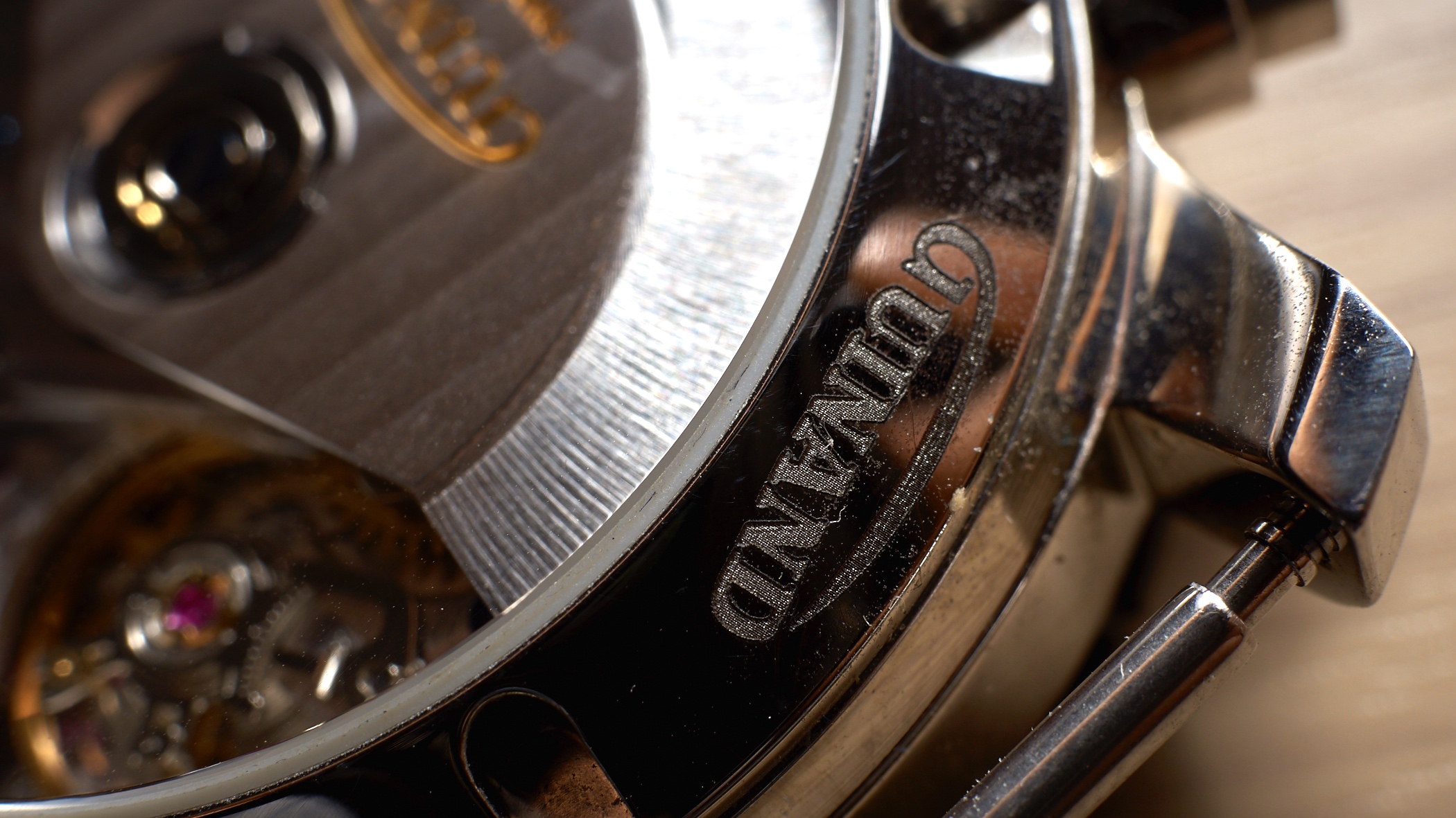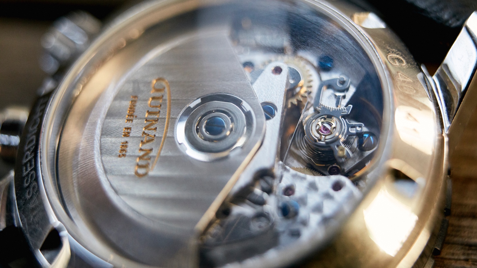 The movement is beautifully decorated with handsome Geneva stripes and Guinand logo engraved on the rotor and some engine turned circles. Blued screws rounds off the movement nicely.