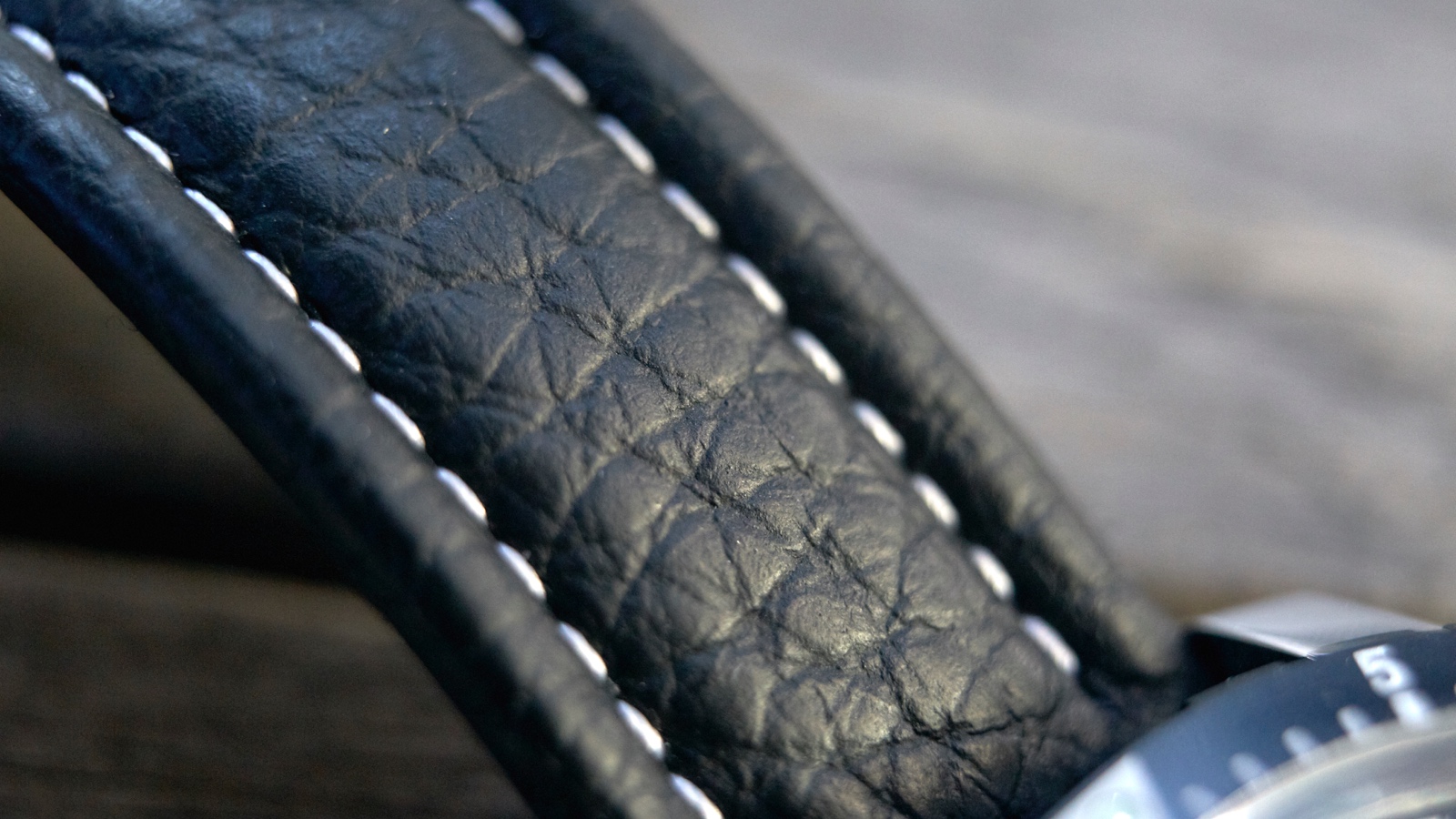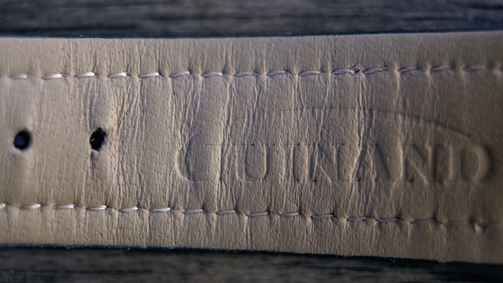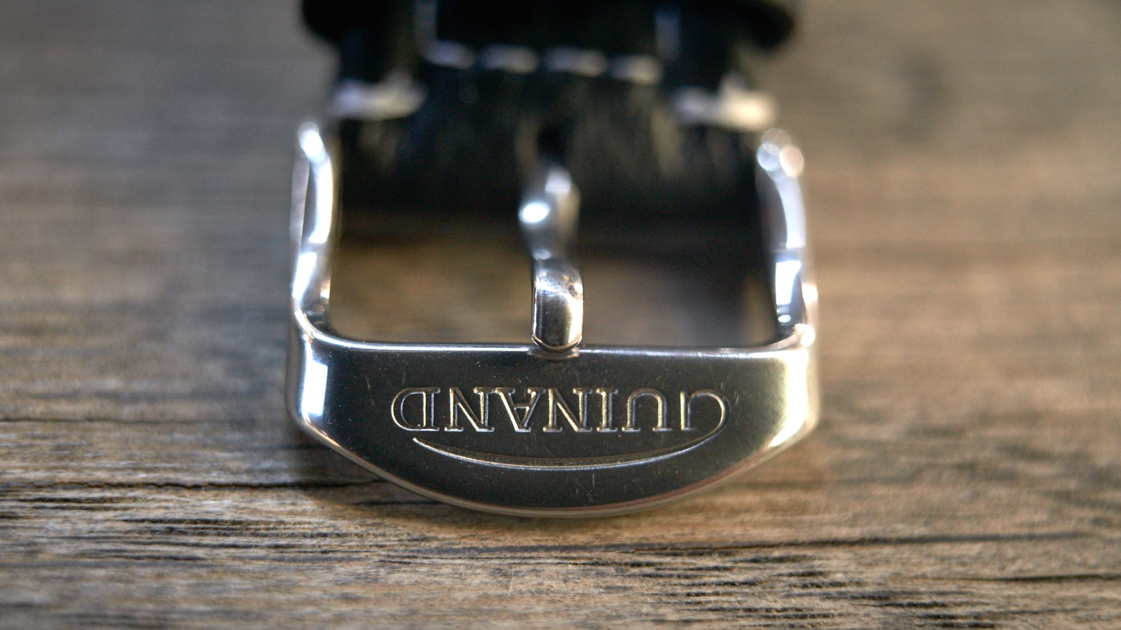 The Guinand came with a quality and pliable black leather pilot strap padded at the center and adorned with contrast white stitching. The buckle, with the name on it, and tang are stainless steel to match the case color.