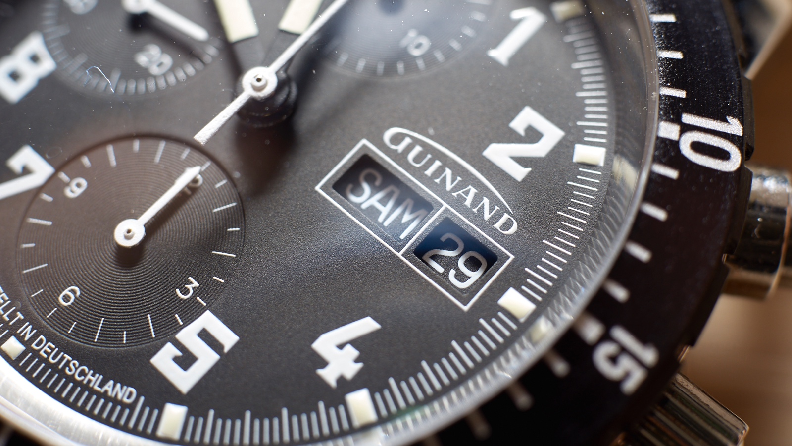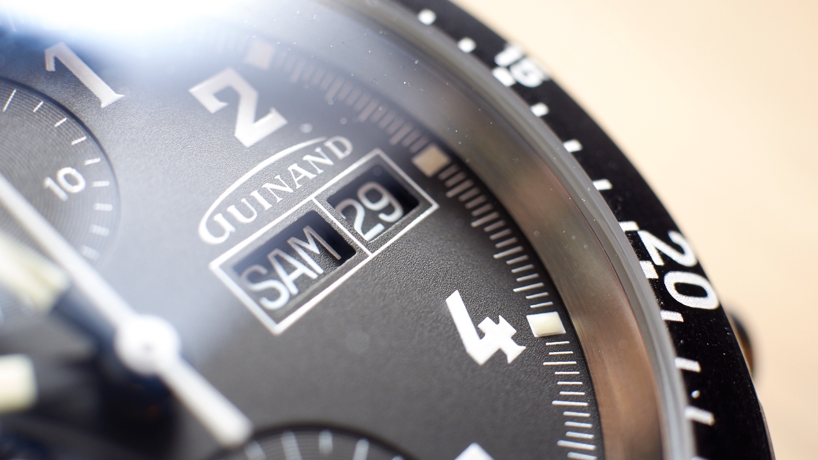 At 3 o’clock is the day-date window with white text on black background, white outlining and the Guinand logo above, emulatig the shape of an airplane wing.