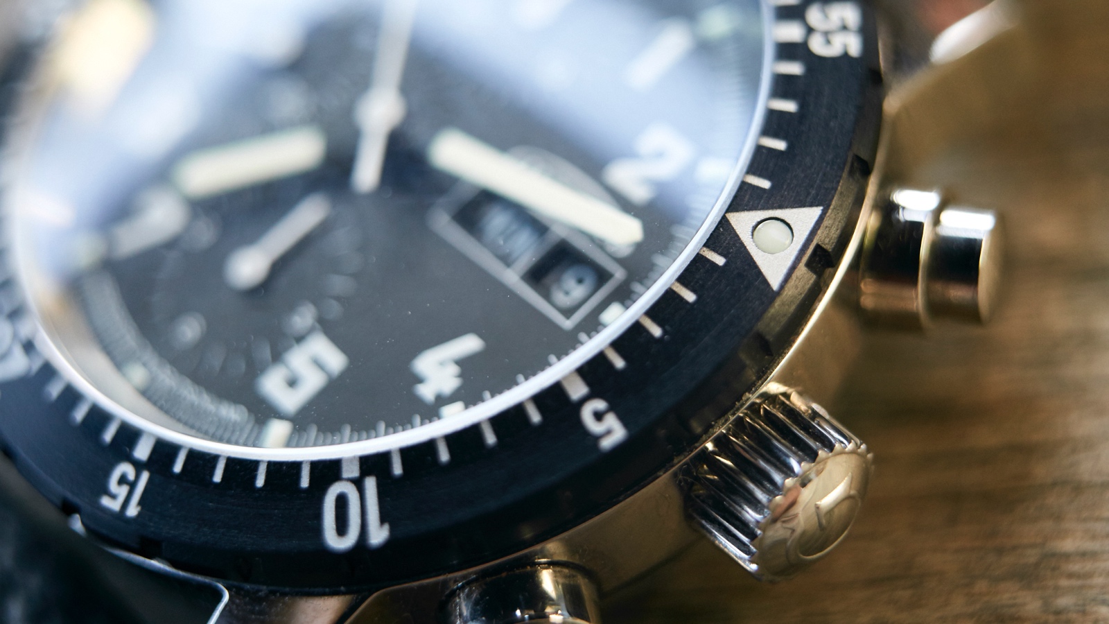 On top is the light metal bi-directional pilots bezel, common on vintage models. Matte black, the bezel shows silver numerals at five minute/second intervals and hash markers in between and with a triangle at 12-o-clock which has a luminescence dot in the middle that glows in the dark. Along its side is subtle, rectangled edging which provides a nice tactile feel when rotating the bezel.